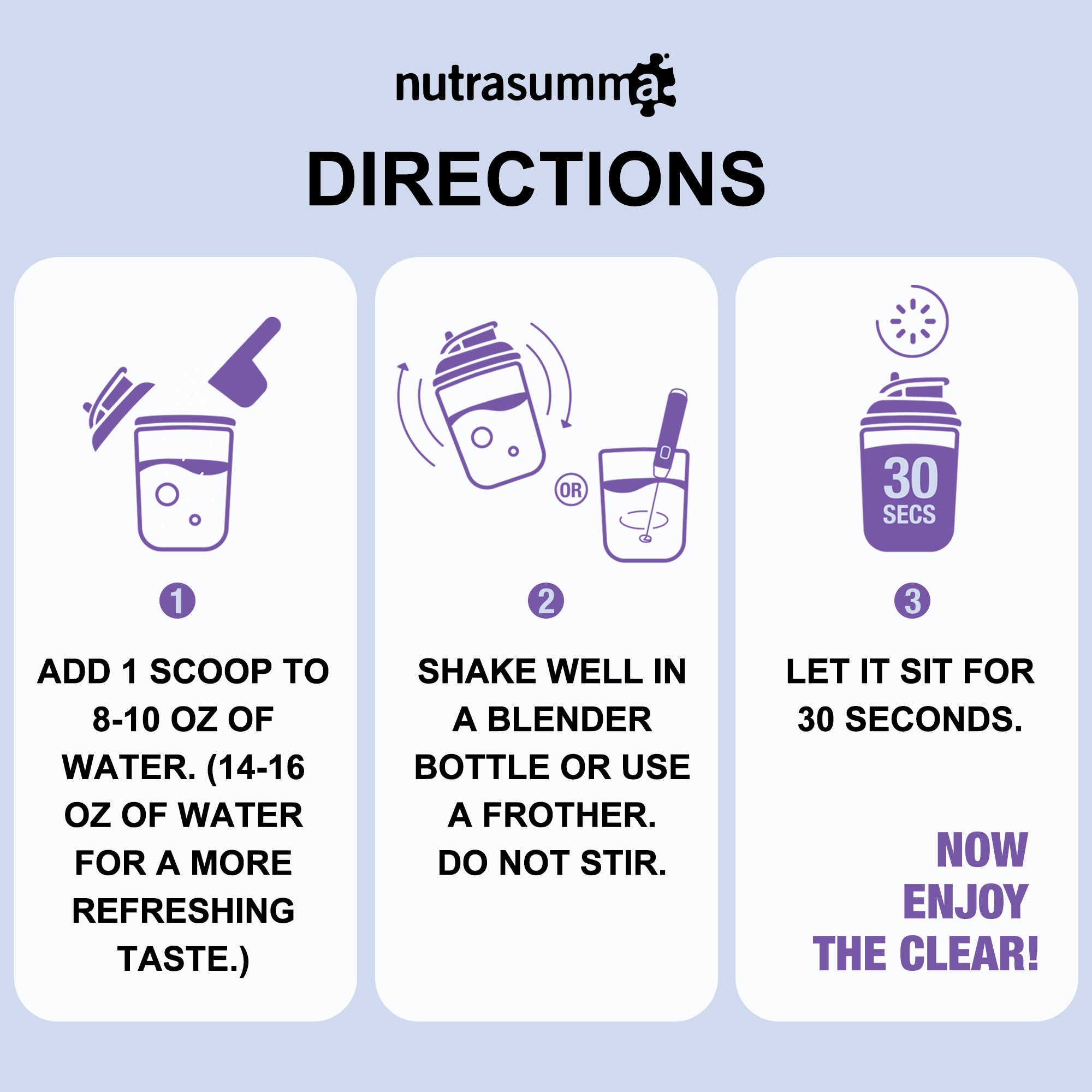 Add one scoop to 8–10 oz of water. For a lighter, more refreshing taste, use 14–16 oz of water and pour over ice. Shake well in a blender bottle or use a frother. Do not stir. Let it sit for 30 seconds, then enjoy your CLEAR.